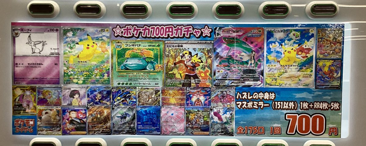 【ポケモンカード販売情報】 完売しておりましたポケカ700円ガチャ補充しました✨️ 今回はピカチュウのプロモやエーフィのプロモが当たりに入っております🎯 他にも人気ポケモンがズラリ‼️ 運試しに1回いかがでしょうか🤩 皆様のご来店お待ちしております🍀