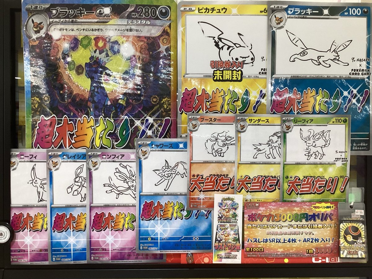 【ポケモンカード販売情報】 ブイズだらけ⁉️✨3000円オリパ✨ こちら販売中です( ꈍ◡ꈍ)🎀 残り2⃣1️⃣口 超大当たりは🌙🔹ブラッキーex ✨SAR✨🔹🌙 ラストワンは💎💥テラスタルフェスex 1BOX💥💎 お求めはカードラボ郡山店までお越しくださいませ🍀