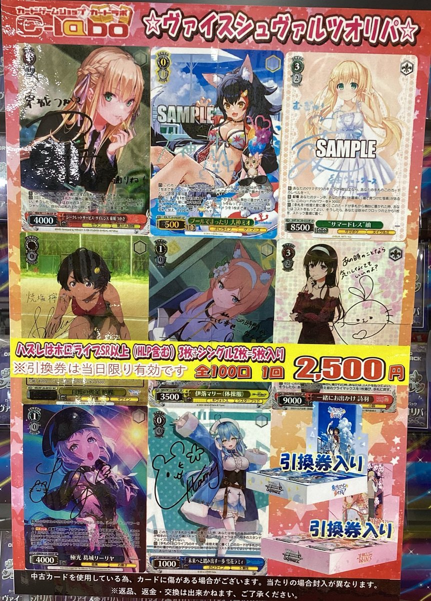 【オリパ 販売情報】 ヴァイスシュヴァルツオリパ好評発売中✨ 🩵ヴァイス2500円オリパ🩵 大当たりは「プールでまったり 大神ミオ SSP」 🩷ヴァイス1000円オリパ🩷 大当たりは「魔獣使い 狂三」 ご挑戦お待ちしております✨