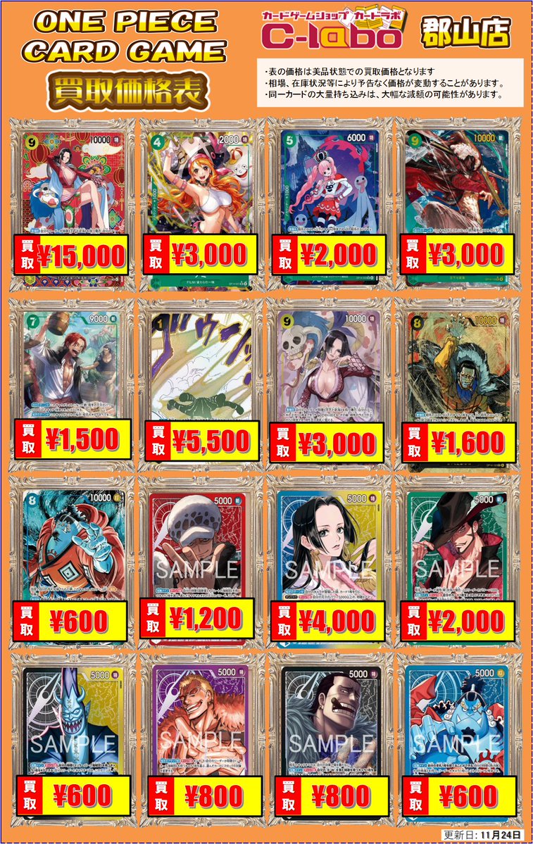 【ワンピースカード 買取情報】 カードラボ郡山店です‼️ こちら最新弾の買取表になります‼️ ジュラキュール・ミホーク【SEC】¥2,000買取 ボア・ハンコック【L/P】{OP14-041}¥4,000買取 お持ち込みお待ちしております🙇♂️