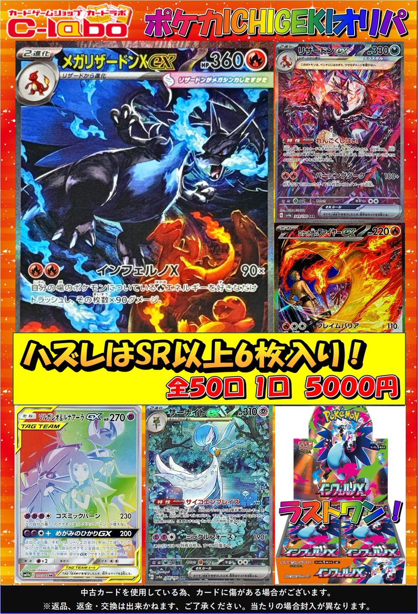 ポケカ5000円オリパ展開中です🔥 大当たりは、メガリザードンXex SAR🔥リザードンex SAR🔥ロケット団のファイヤーex などなど またラストワン賞に、インフェルノX 1BOX をご用意しております ぜひご来店お待ちしております❣