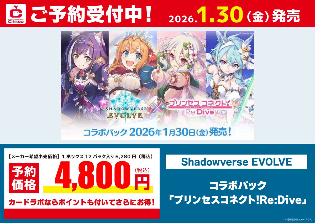 【予約情報】 Shadowverse EVOLVE コラボパック 「プリンセスコネクト!Re:Dive」 こちら予約開始いたしました‼️ ご予約はカードラボ郡山店まで♪