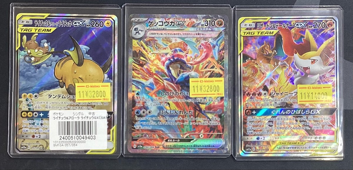 【ポケモンカード 販売情報】 ・ライチュウ&アローラライチュウGX ・ゲッコウガex SAR ・リザードン&テールナーGX 価格調整いたしました⚡️🔥🌊 大変お求めやすくなっております♪ ご来店お待ちしております🙇♂️