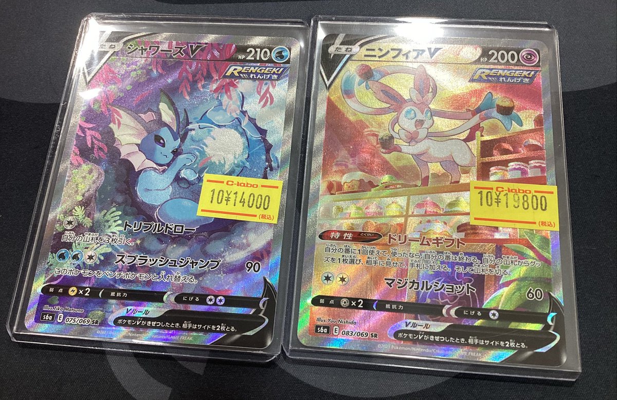 【ポケモンカード 販売情報】 シャワーズV SR ニンフィアV SR ショーケースに展開中です♪ 是非ご来店お待ちしております❤️
