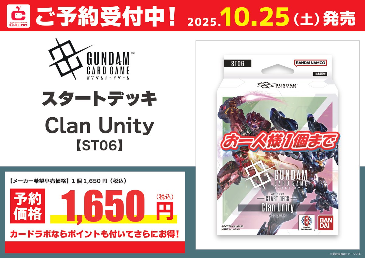 【ガンダムカードゲーム 予約情報】 10/25発売‼ スタートデッキ Clan Unity ご予約受付中です おひとりさま1個まで ぜひご来店お待ちしております