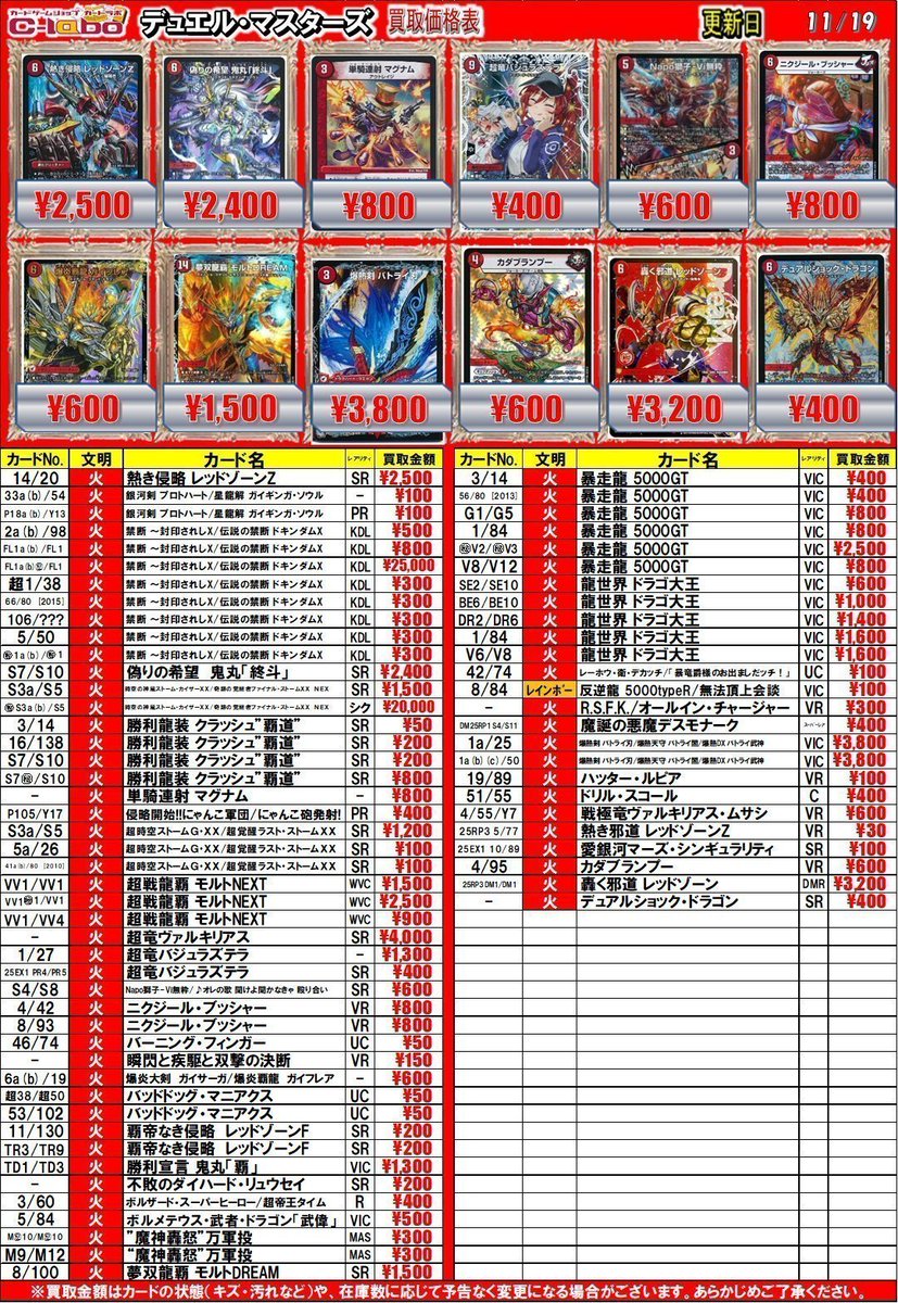 【デュエマ 買取情報】 偽りの希望 鬼丸「終斗」¥21,000 熱き侵略 レッドゾーンZ¥11,000 飛翔龍 5000VT¥25,000 などなど金トレジャーの買取表になります 是非お持ち込みお待ちしております♪