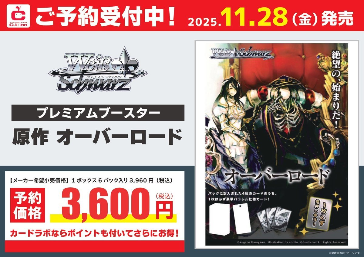 【WS 予約情報】 11/28発売 プレミアムブースター 「原作 オーバーロード」 12月26日発売 ブースターパック 『プロジェクトセカイ カラフルステージ! feat. 初音ミク Vol.3』 1/16発売 『テイルズオブシリーズ』 ご予約受付中です!! 是非ご来店お待ちしております