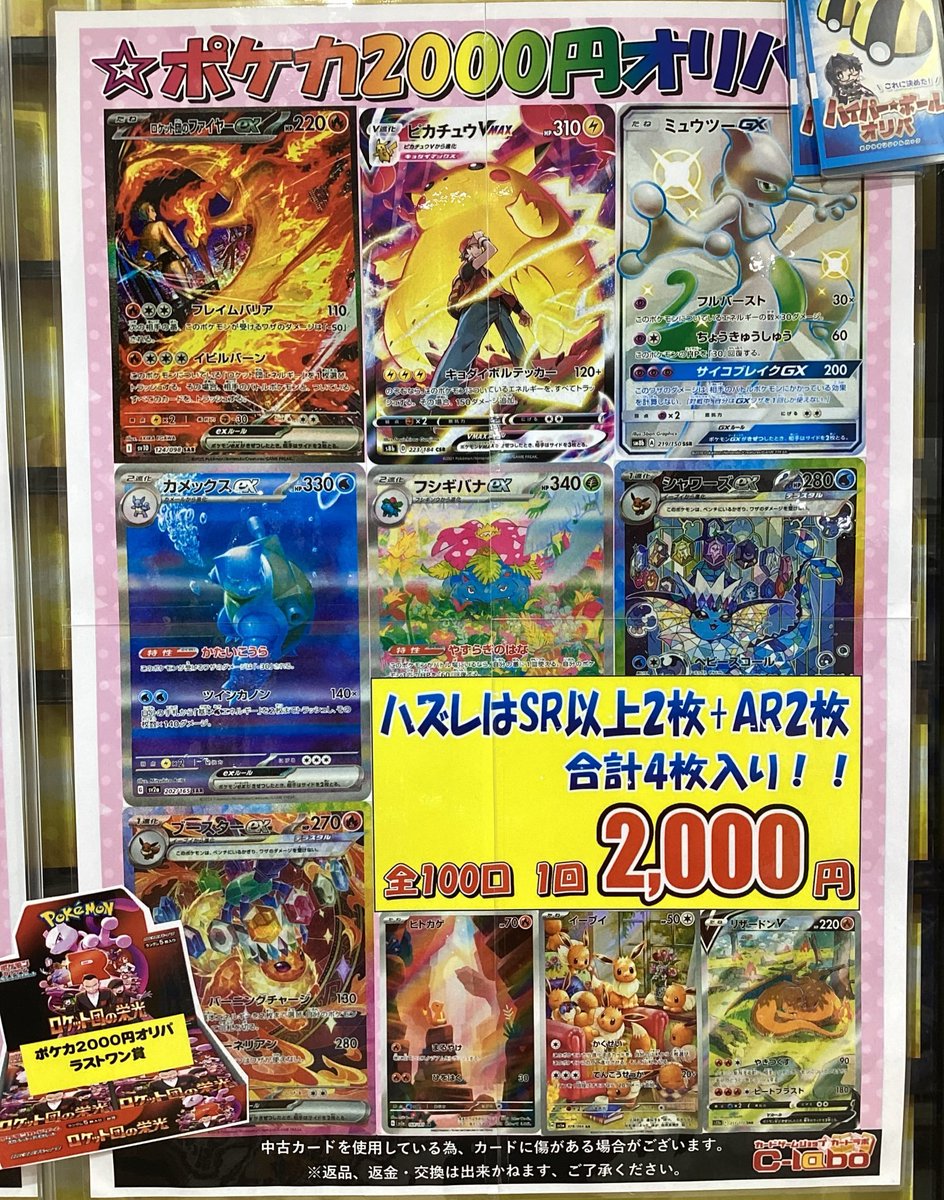 【ポケモンカード販売情報】 完売しておりましたポケカ2000円オリパ、 新たに作成しました!! ミュウツーGX SSR、ピカチュウVMAX CSR ロケット団のファイヤーex SARなど入っております🤩‼️ ラストワンにはロケット団の栄光1BOX🎁✨ ぜひ運試しにご挑戦ください♪̊̈♪̆̈
