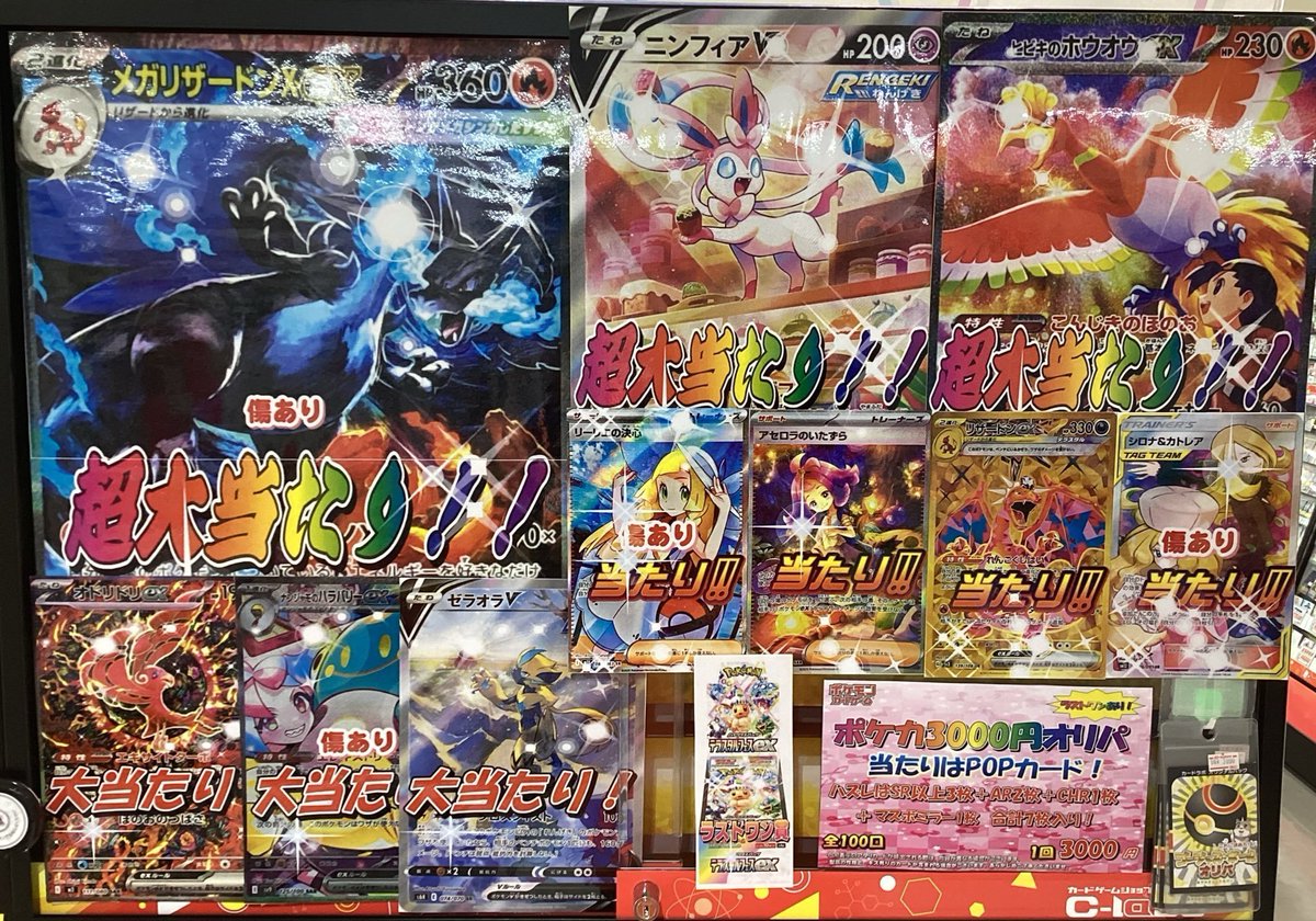 【ポケモンカード販売情報】 ポケカ3000円オリパ 残り 6️⃣2️⃣口となっております!! 当たりにはメガリザードンXex SARやオドリドリex SARなど🤩🔥🔥 ラストワンにはテラスタルフェス1BOX‼️‼️ ぜひご挑戦ください✨✨ お客様のご来店お待ちしております٩( ¨ )ว=͟͞