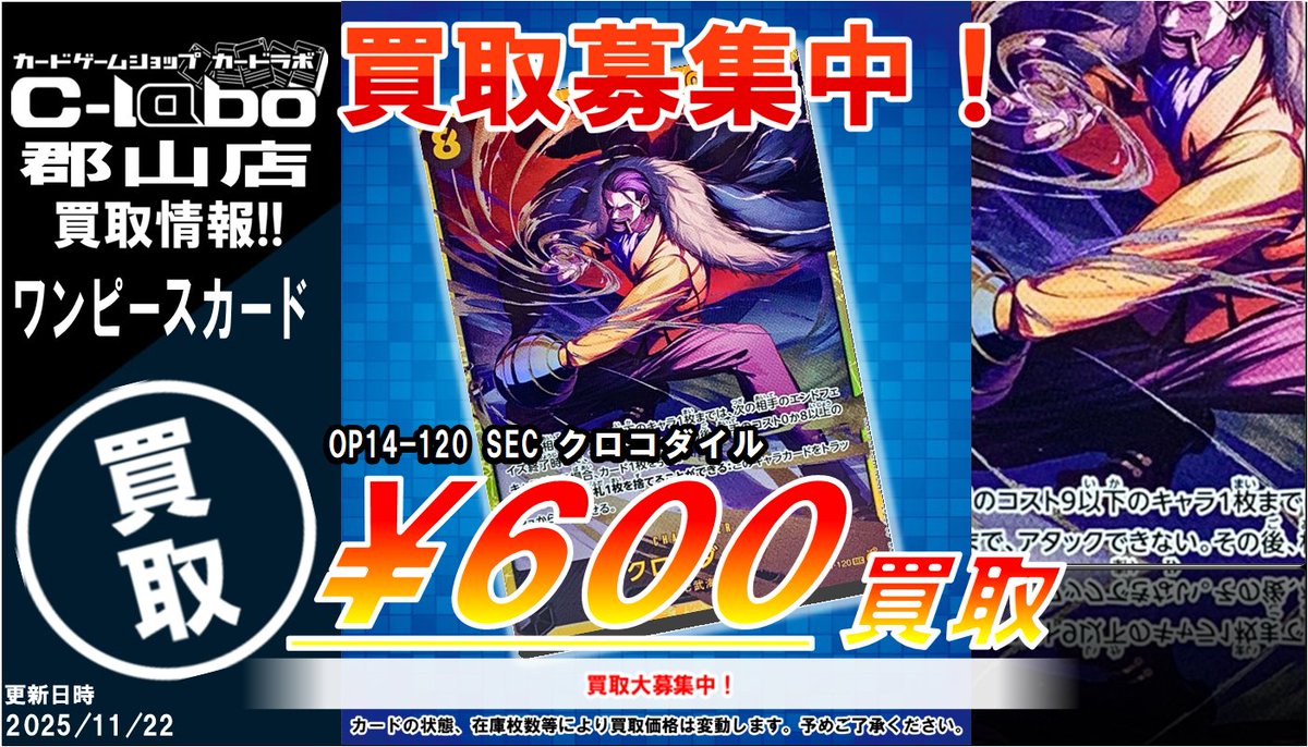 【ワンピースカード買取情報】 OP14-120 SEC クロコダイル ¥600買取 OP14-120 SEC クロコダイル ¥600買取 OP14-120 SEC クロコダイル ¥600買取 在庫足りておりません💦 カードラボ郡山店までぜひお持ち込みお願いします!!