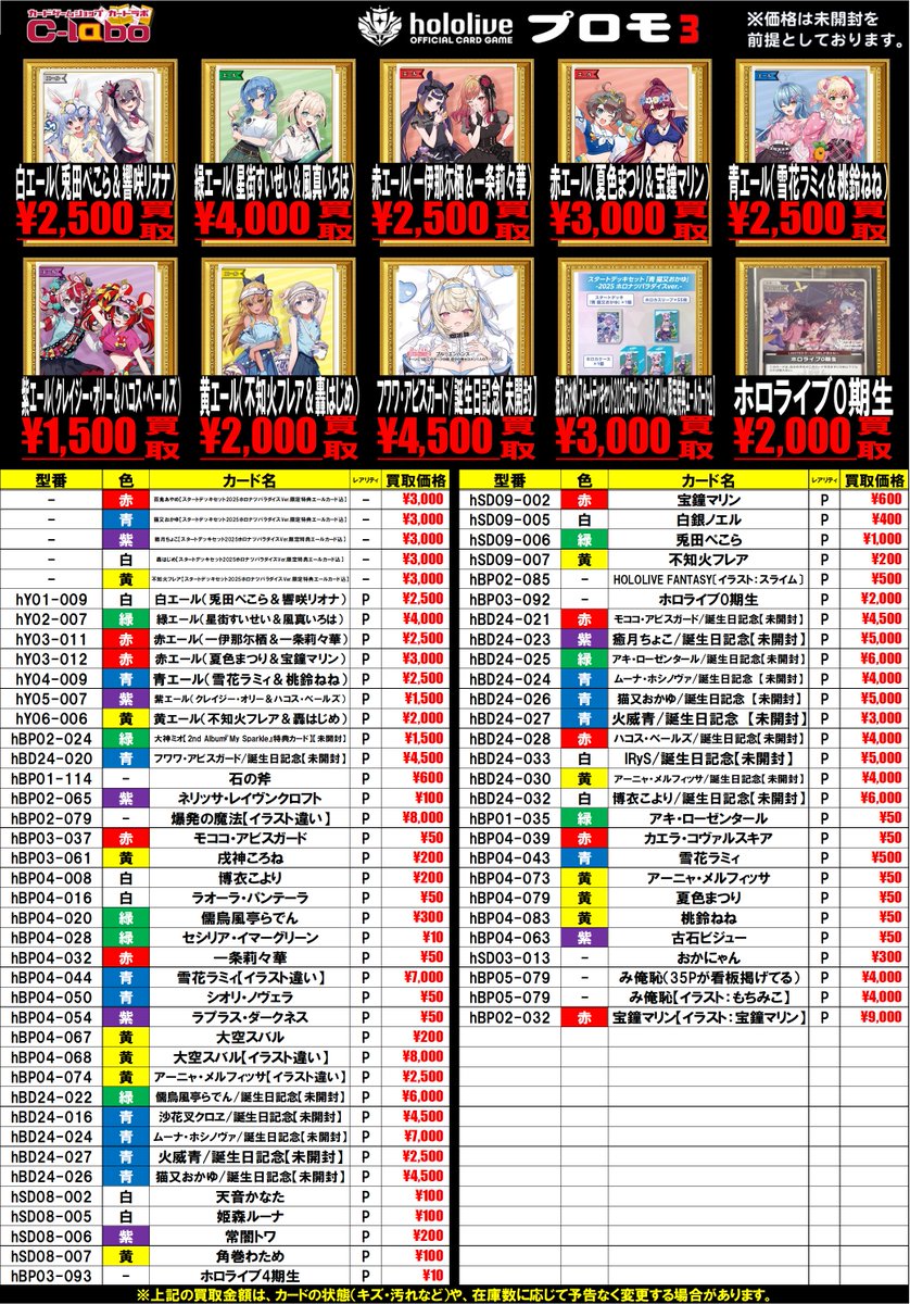 【ホロカ 買取情報】 白エール(兎田ぺこら&響咲リオナ)P¥2,500 緑エール(星街すいせい&風真いろは)P¥4,000 赤エール(一伊那尓栖&一条莉々華)P¥2,500 などなどプロモカードお買取募集中です ぜひお持ち込みお待ちしております!!