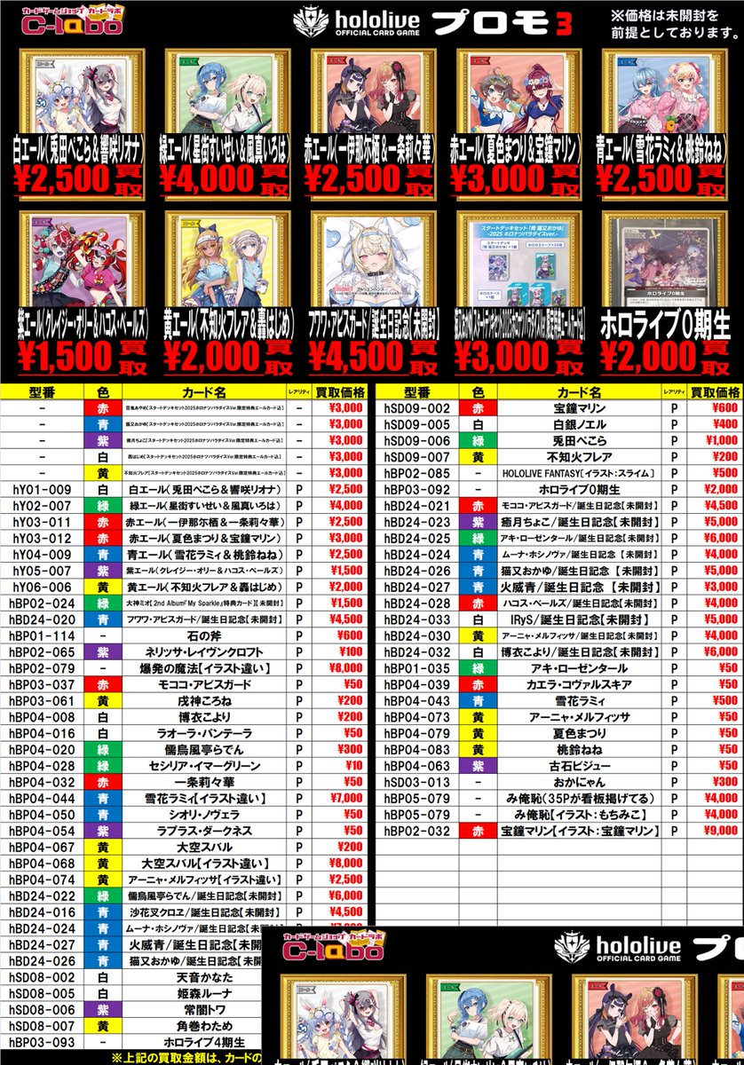 【ホロカ 買取情報】 プロモカードお買取しております!! 白エール(兎田ぺこら&響咲リオナ)P¥2,500 緑エール(星街すいせい&風真いろは)P¥4,000 赤エール(一伊那尓栖&一条莉々華)P¥2,500 などなど 是非お持ち込みお待ちしております♪