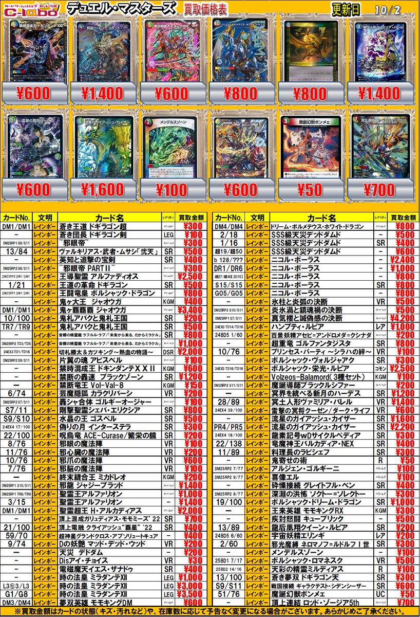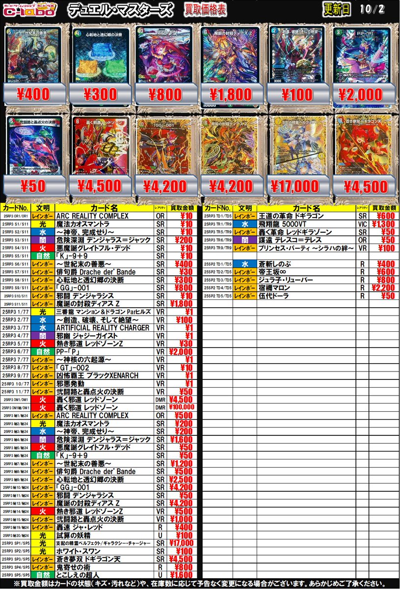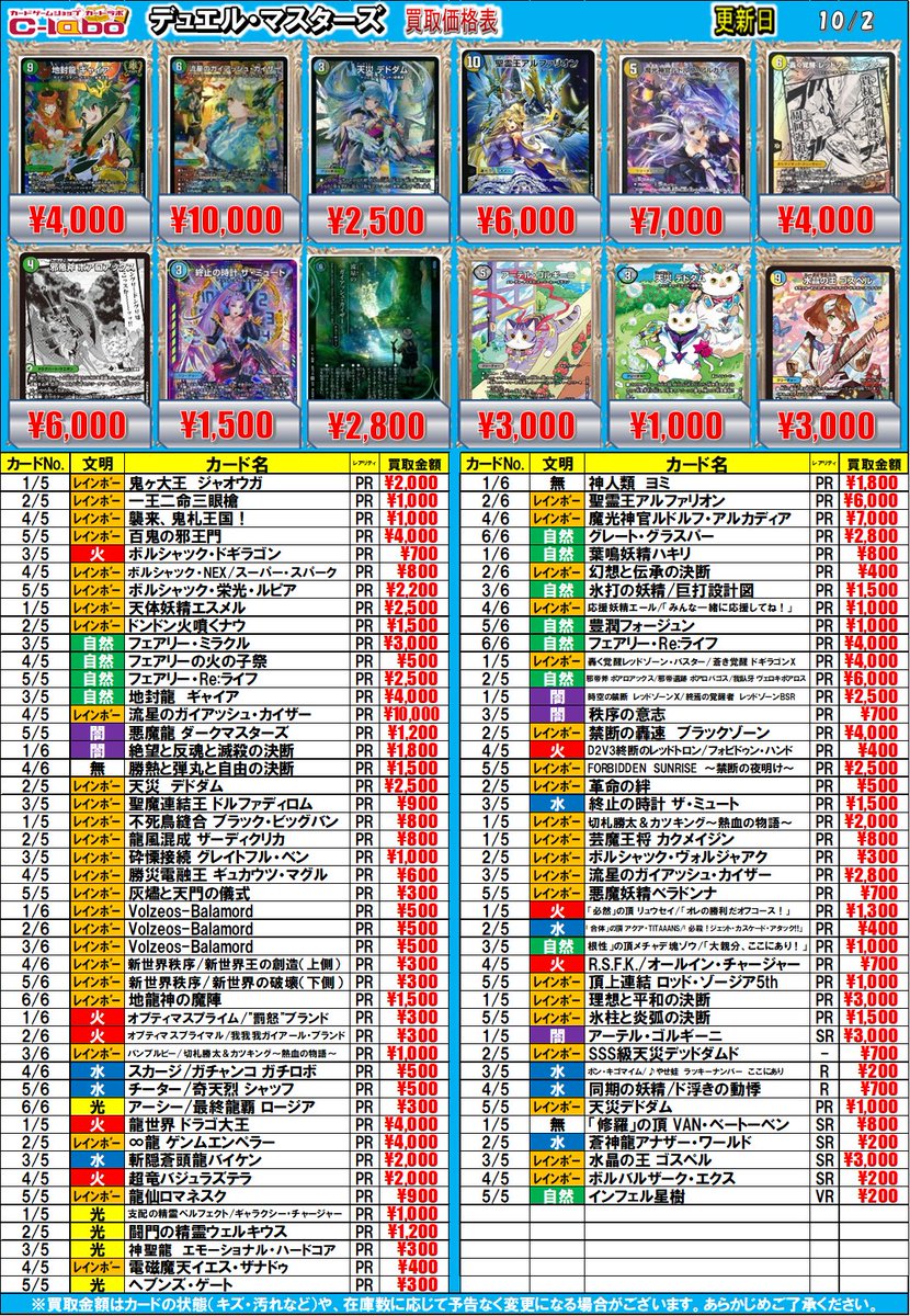 【デュエマ 買取情報】 各文明の買取表になります!! 悪夢神バロム・ナイトメア ドリームレア ¥1,600 勝利宣言 鬼丸「覇」 VIC ¥1,400 地封龍 ギャイア SR ¥2,200 真気楼と誠偽感の決断スーパーレア¥4,200 などなど 是非お持ち込みお待ちしております