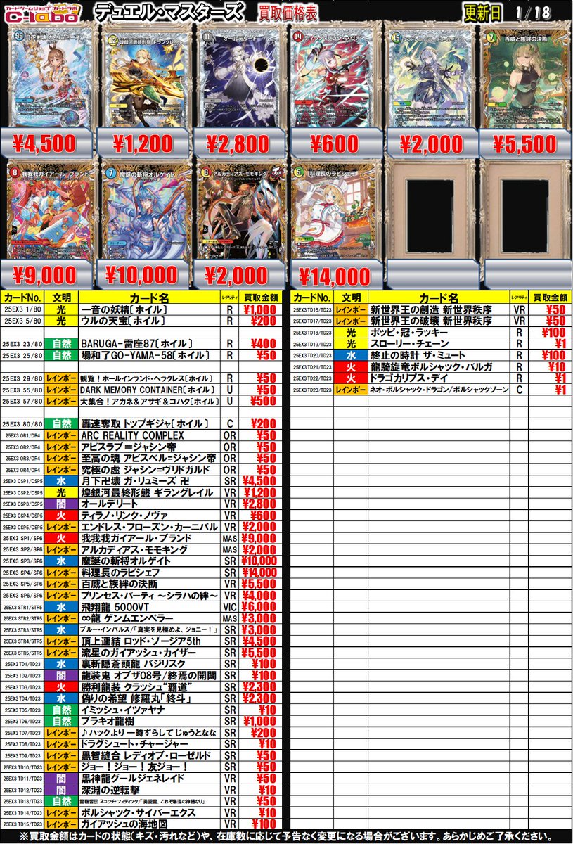 【デュエマ買取情報】 最新弾 『邪神爆発デュエナマイトパック「王道W」』 買取表です‼ お持ち込み、お待ちしております‼ ※状態や在庫状況、相場によって予告無く終了する可能性がございます。ご了承ください。