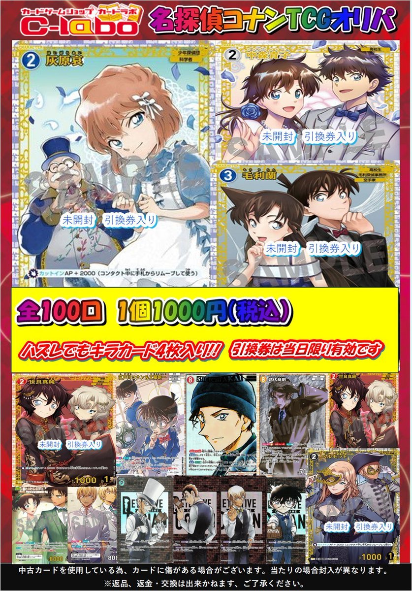 【コナンTCG 販売情報】 1️⃣0️⃣0️⃣0️⃣円オリパ新しく展開致しました‼️ 大当たりは 灰原哀✨中村育子✨毛利蘭✨ などなど🔥🔥❗️ 引換券がでた際はお近くのスタッフまでお声掛けください! よろしくお願いします🙌