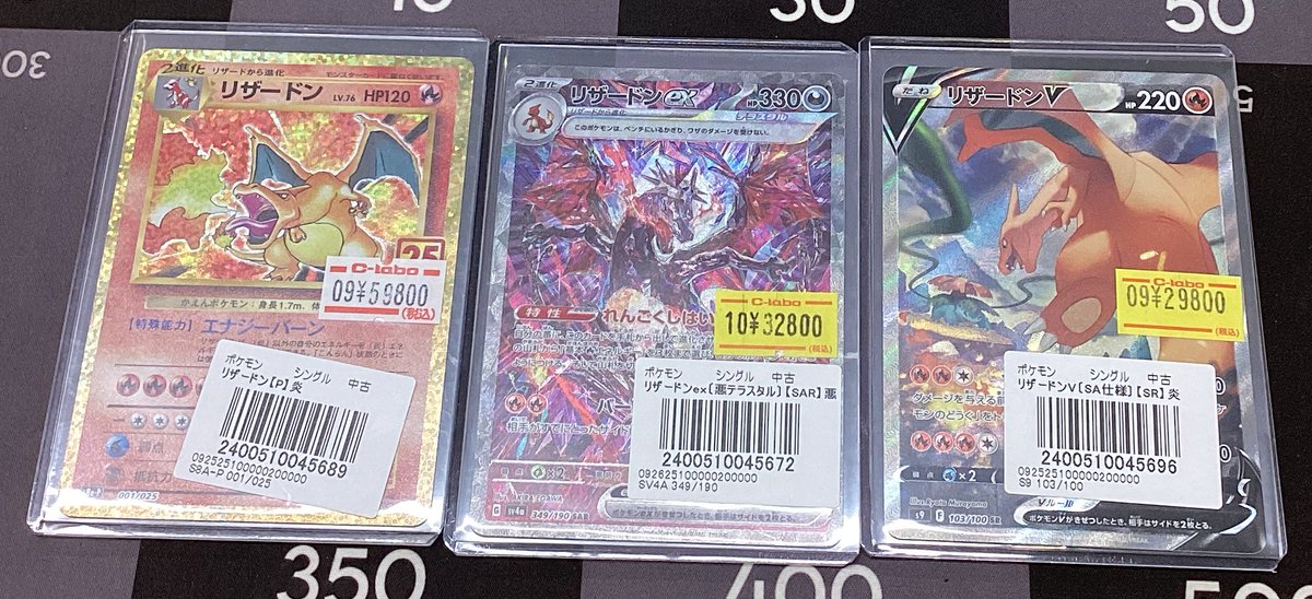 【ポケモンカード 販売情報】 🔥リザードン 001/025🔥 🖤リザードンex 349/190🖤 🔥リザードンV 103/100🔥 販売中です!!!! 是非当店までお越しください🍀* ゚
