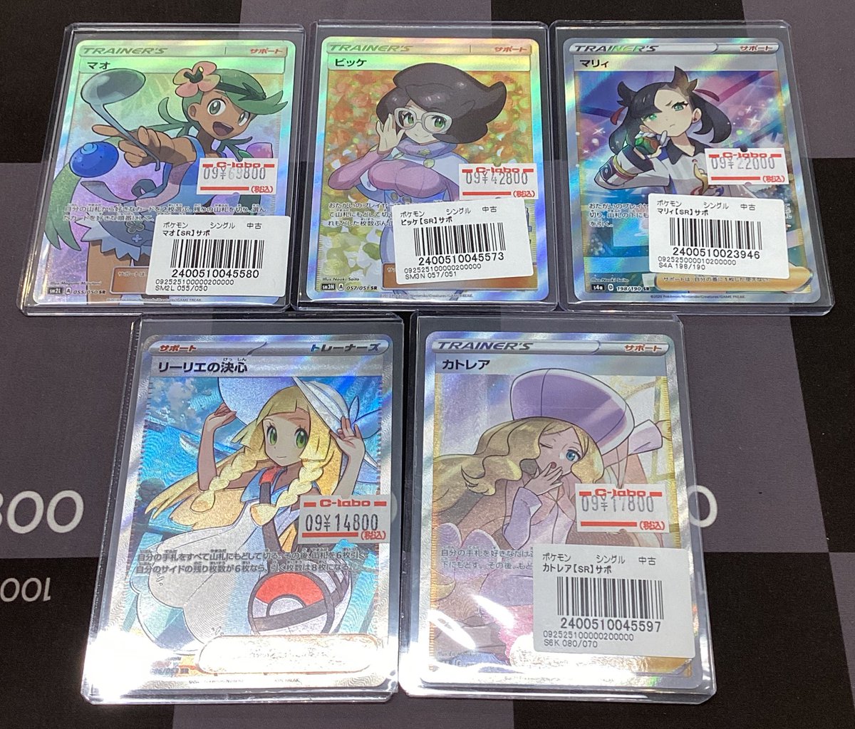 【ポケモンカード 販売情報】 可愛いサポートSR販売中です︎💕︎ ・マオ 055/050 ・ビッケ 057/051 ・マリィ 198/190 ・リーリエの決心 086/063 ・カトレア 080/070 是非当店までお越しください🍀* ゚