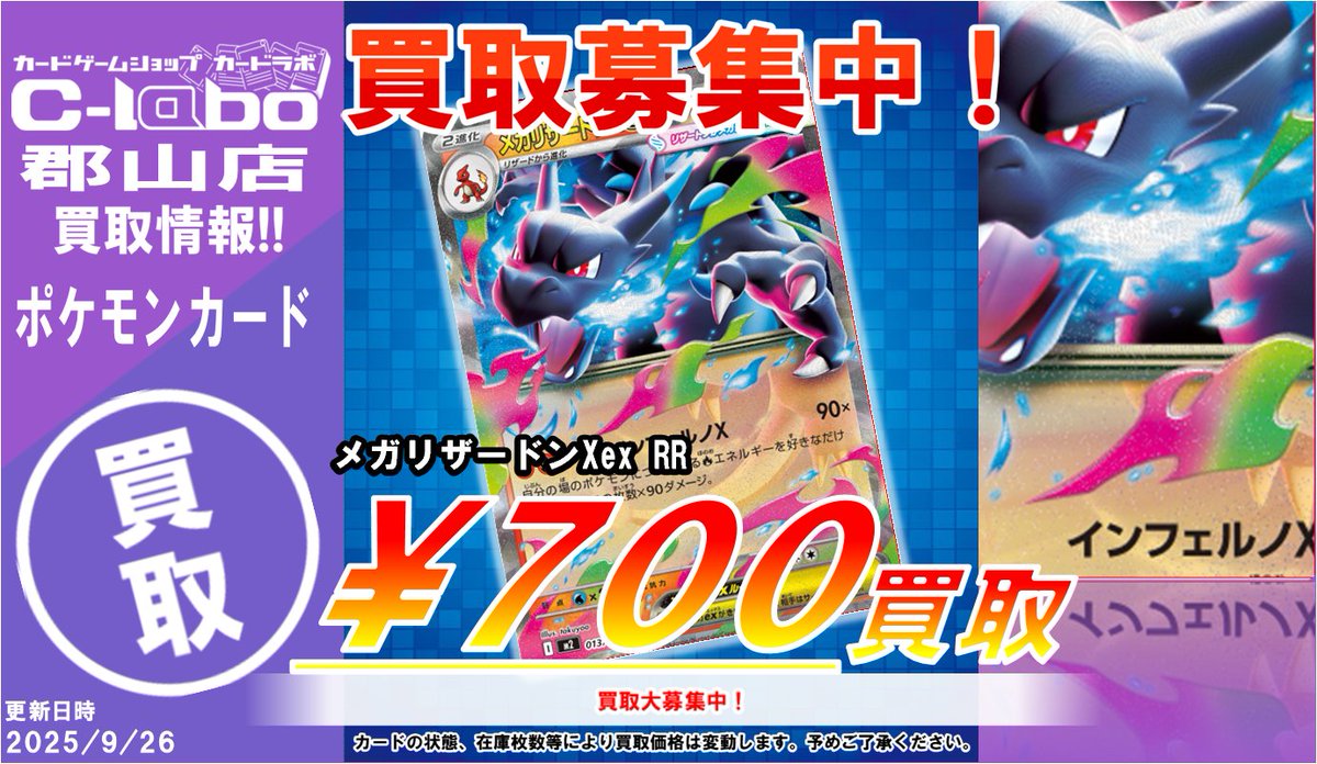 【ポケモンカード買取情報】 🔥メガリザードンXex RR ¥700買取🔥 🔥メガリザードンXex RR ¥700買取🔥 🔥メガリザードンXex RR ¥700買取🔥 在庫集めております!! カードラボ郡山店までぜひお持ち込みお願いします🙇♀️