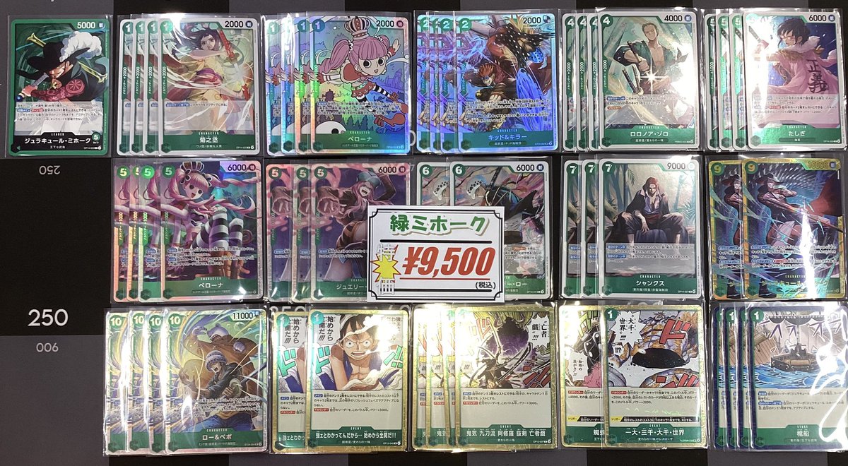 【ワンピースカード 販売情報】 緑ミホークデッキ作成いたしました🟢 大特価¥9,500での販売です🉐 ご来店お待ちしております‼️
