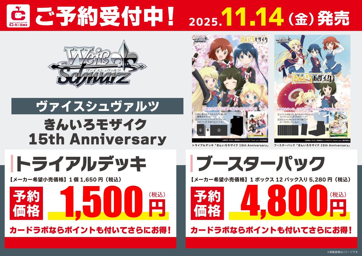 【WS 予約情報】 きんいろモザイク 15th Anniversary ・トライアルデッキ ・ブースターパック ご予約開始致しました! ご予約ご希望の方はぜひカードラボ郡山店まで