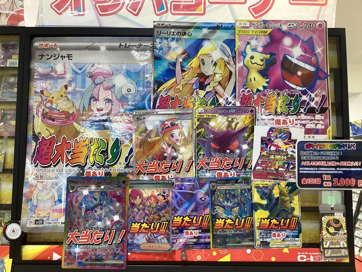 【ポケモンカード販売情報】 ポケカ3️⃣0️⃣0️⃣0️⃣円オリパ展開中です🔥 ナンジャモ SAR🎯リーリエの決心🎯ゲンガー&ミミッキュGX などなど‼️ ラストワン賞もございます😊 是非ご来店お待ちしております♪