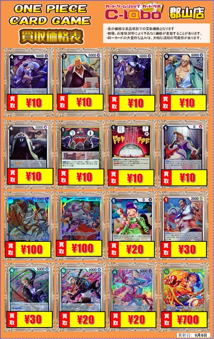 【ワンピースカード 買取情報】 ワンピ定額買取、実施中です🔥 パラレル ¥200買取 SR ¥10買取 ぜひカードラボ郡山店までお持ち込みください‼️ ※一部対象外のカードがございます。 詳細は画像をご確認ください。