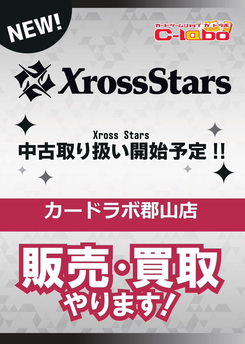 【カードラボ郡山店よりお知らせ】 ◇━━━━━━━━━━━━━━━━━━◇ カードラボ郡山店では 「Xross Stars」中古取扱を開始します❣❣ ◇━━━━━━━━━━━━━━━━━━◇ 新品の取り扱いもございますので、是非ご利用お待ちしております🔥