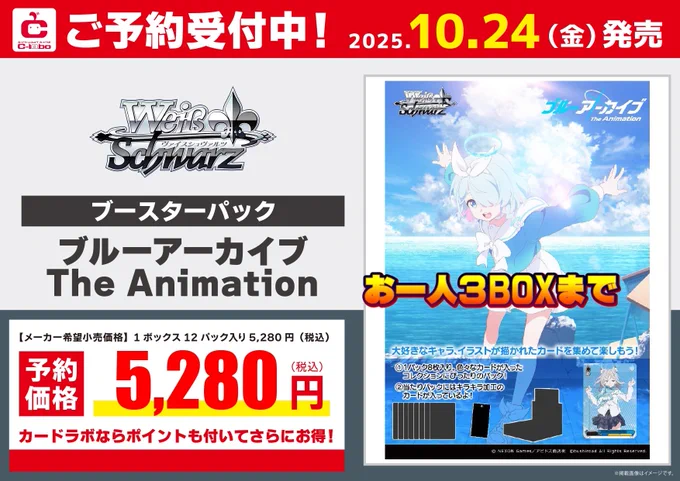 【WS 予約情報】 10/24発売 「ブルーアーカイブ The Animation」 予約受付を開始いたしました!! ※お1人様3BOXまで ※上限に達し次第終了となります 是非ご来店お待ちしております