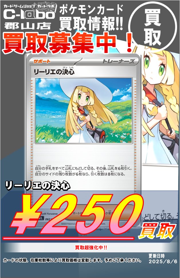 【ポケカ買取情報】 👒リーリエの決心 ¥250買取👒 👒リーリエの決心 ¥250買取👒 👒リーリエの決心 ¥250買取👒 まだまだ買取募集中🔥 皆様のお持ち込みお待ちしております😊