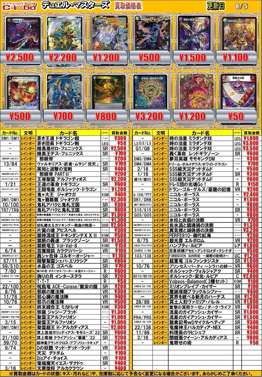 【 デュエマ 買取情報】 暗黒凰ゼロ・フェニックスSR¥2,500 暗黒王デス・フェニックスSR¥700 龍世界 ドラゴ大王PR¥5,000 ∞龍 ゲンムエンペラーPR¥4,500 などなど 是非お持ち込みお待ちしております!!