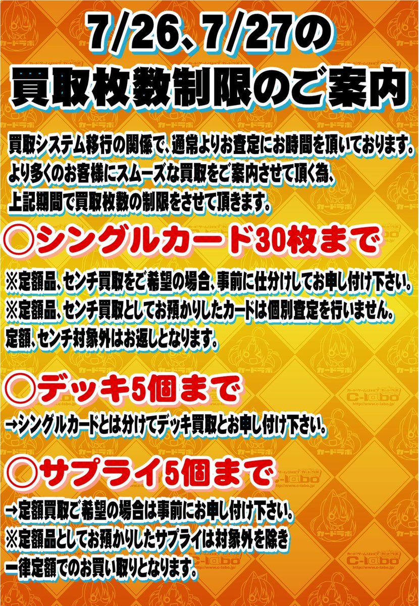 【買取査定についてのご案内】 7/26(土)~7/27(日)の期間におきまして買取受付の枚数に制限を設けさせていただきます。 ご利用のお客様にはご不便をお掛けしますが、 何卒よろしくお願いいたします。 詳細は画像をご確認くださいませ