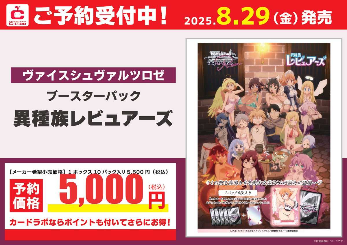 【#ヴァイスシュヴァルツロゼ 予約情報📢】 ヴァイスシュヴァルツロゼより 8/29発売 ブースターパック『異種族レビュアーズ』 10/31発売 ブースターパック『sprite』 予約開始致しました! 是非ご来店お待ちしております♪