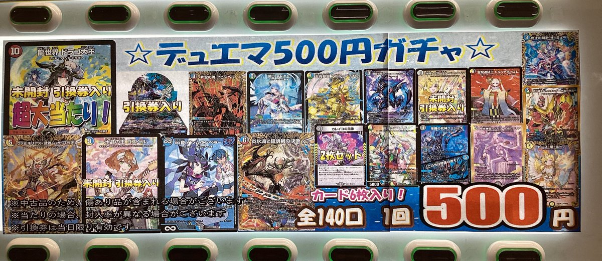 デュエマ500円新しく展開いたしました♪ 大当たりは🎯龍世界ドラゴ大王🎯水晶の王ゴスペル🎯♾️龍ゲンムエンペラーなどなど❤️🔥 是非ご来店お待ちしております