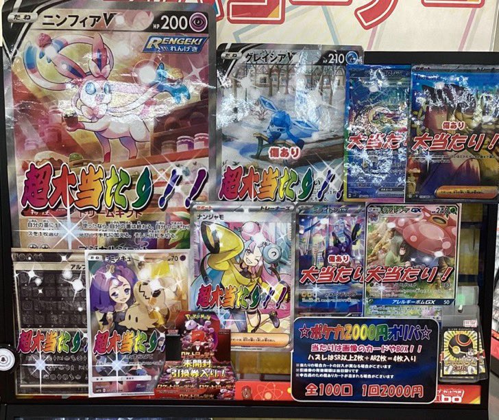 【オリパ 販売情報】 ポケカオリパ好評配信中です⚡️ 🌟ポケカ2000円オリパ🌟 大当たりは『ニンフィアV』 🌟ポケカ800円オリパ🌟 大当たりは『ラティアスex』 他にも画像のカードやBOXが当たります! ご挑戦お待ちしております!!