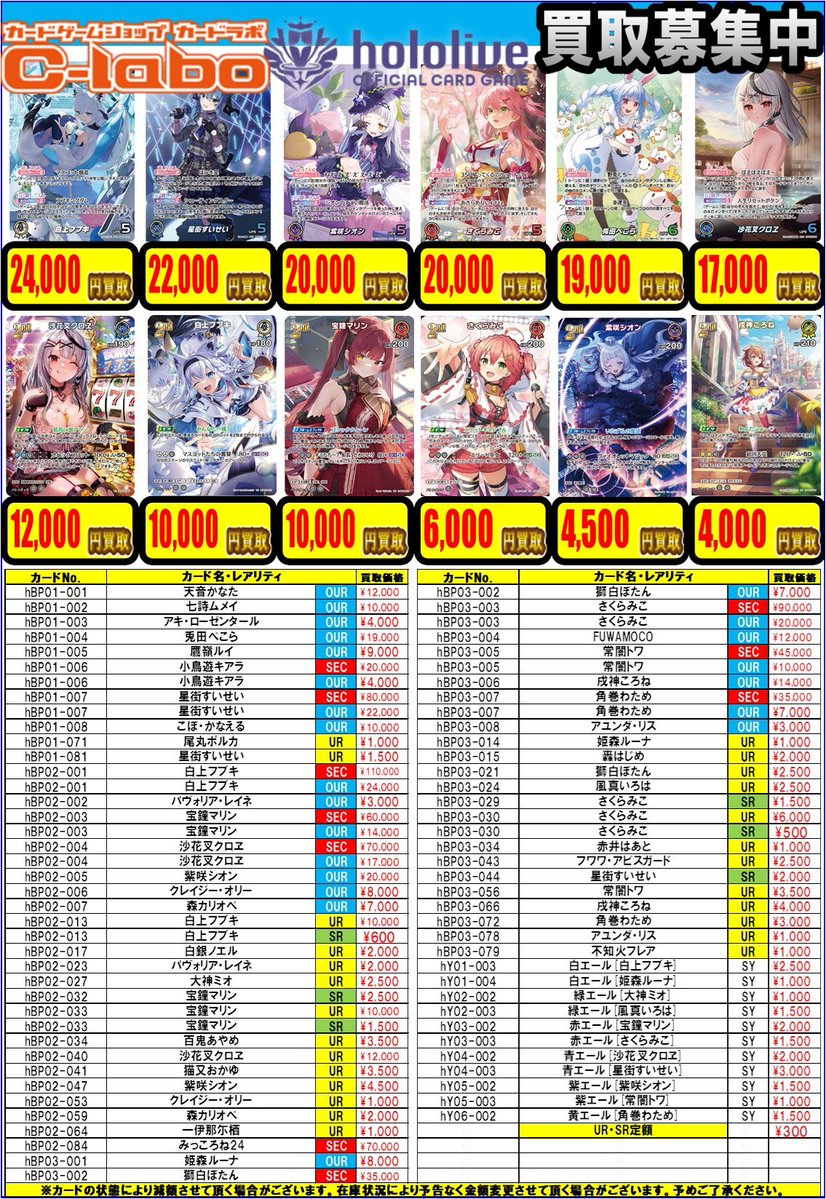 【ホロカ 買取情報】 プロモや高レア、最新弾シングルなど買取募集中です🔥 ・兎田ぺこら〔イラスト違い/OUR仕様〕P¥500,000 ・天音かなたOUR¥12,000 ・七詩ムメイOUR¥10,000 ・アキ・ローゼンタールOUR¥4,000 記載以外のカードも査定しておりますので 是非お持ち込みお待ちしております