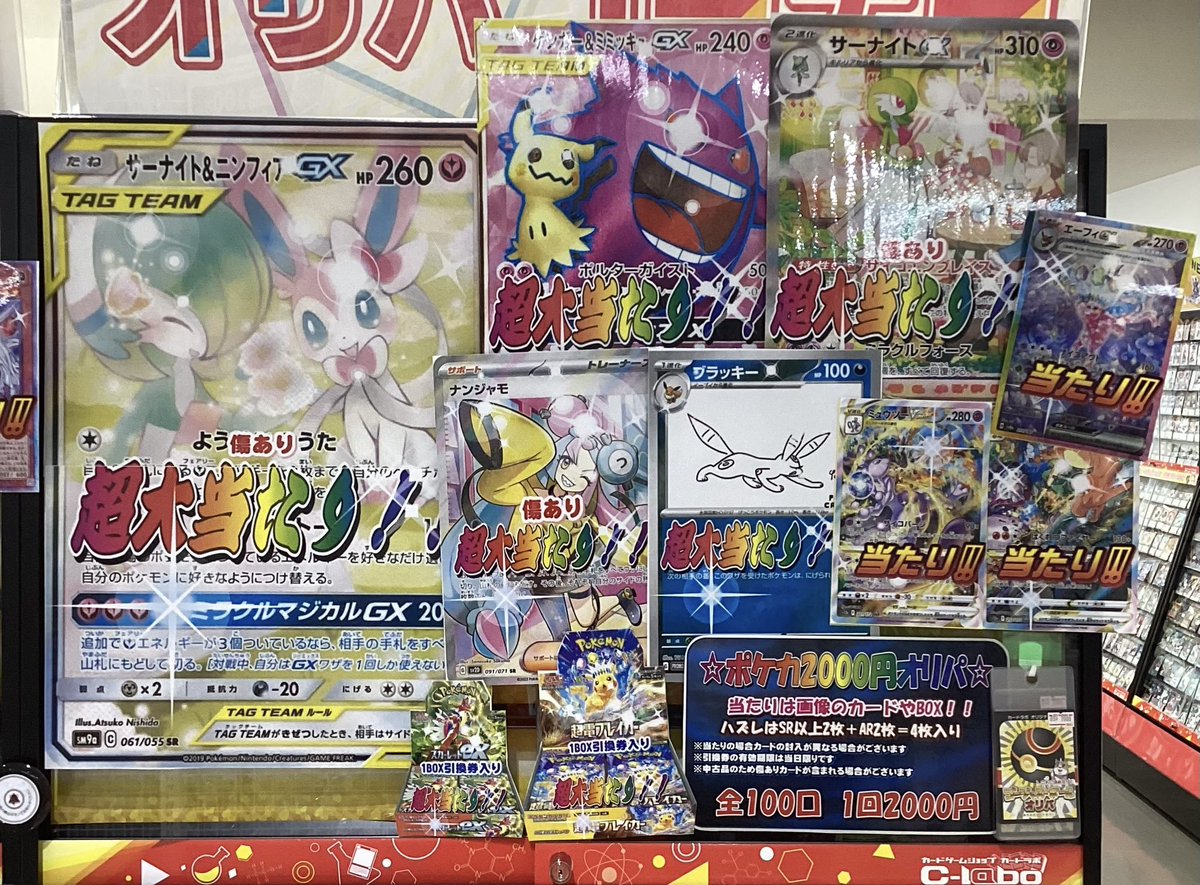 【オリパ 販売情報】 ☆ポケカ2000円ガチャ☆ 新しく展開いたしました✨ 今回の大当たりは『サーナイト&ニンフィアGX』です!! 他にも画像のカードやBOXが当たります🧡 ご来店お待ちしております🍀.⋆