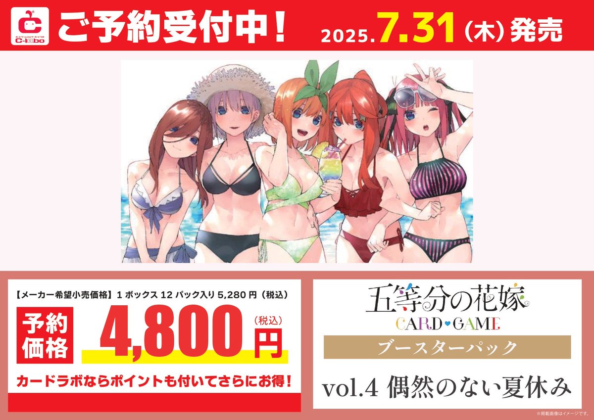 【❣️予約情報❣️】 五等分の花嫁カードゲームより 7/31(木)発売 ブースターパック 『偶然のない夏休み』 予約受付中です☀️🎵 ご予約ご希望の方はカードラボ郡山店まで✨ 皆様のご来店をお待ちしております!!
