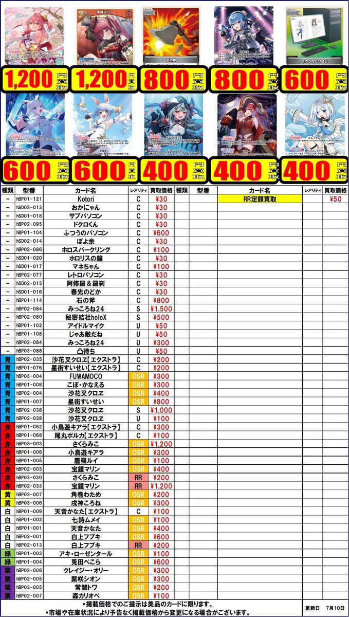 【ホロカ 買取情報】 プロモや汎用、高レア募集中です!!! ・hBP01-102アイドルマイク ¥8,000 ・hBP01-108じゃあ敵だねP ¥5,000 ・hBP02-084みっころね24SEC ¥70,000 ・hBP03-004FUWAMOCOOUR ¥12,000 などなど 是非お持ち込みお待ちしております