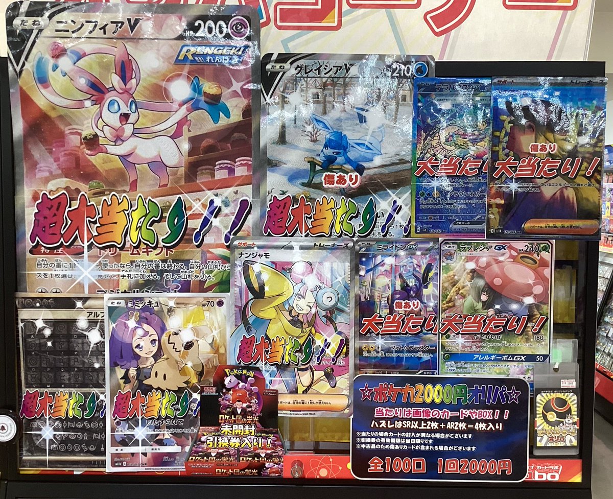 【ポケモンカード販売情報】 ポケカ2000円オリパ展開しました✨ 大当たりにはニンフィアV🎀🎀🎀 他にもグレイシアVやロケット団の栄光未開封BOXなど… お1ついかがでしょうか😆 皆様のご来店お待ちしております🍀