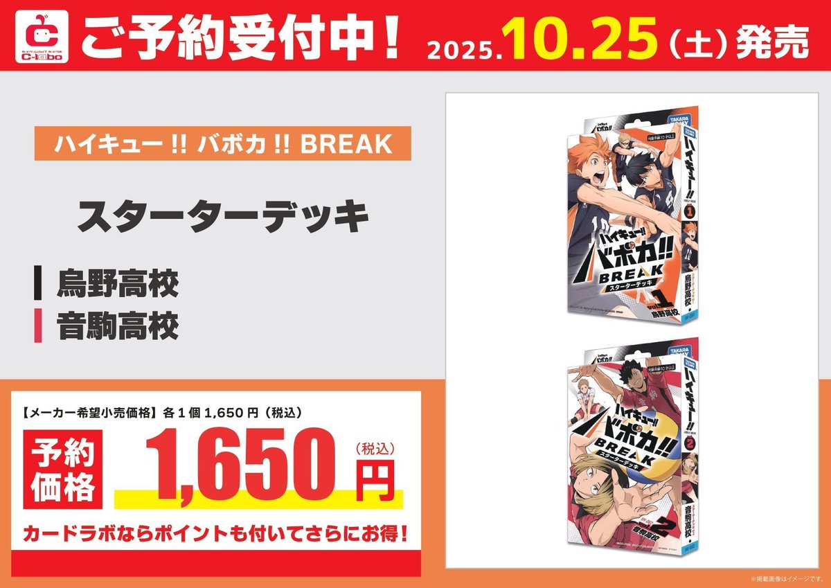 【ハイキュー!!バボカ!! 予約情報】 10月25日(土) 🔥スターターデッキ🔥 「烏野高校」 「音駒高校」 🏐ブースターパック🏐 「ゴミ捨て場の決戦」 こちらの商品の予約を開始いたしました✨ 是非カードラボ郡山店までお待ちしております❣