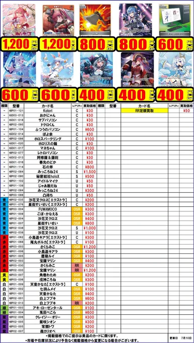 【ホロカ 買取情報】 プロモや汎用、高レア募集中です!!! ・hBP01-102アイドルマイク ¥8,000 ・hBP01-108じゃあ敵だねP ¥5,000 ・hBP02-084みっころね24SEC ¥70,000 ・hBP03-004FUWAMOCOOUR ¥12,000 などなど 是非お持ち込みお待ちしております