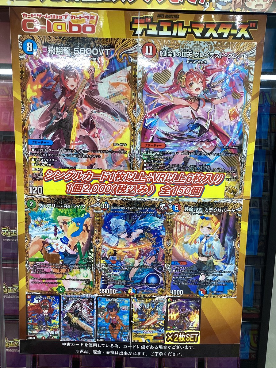デュエマ2000円オリパ展開中です♪ 大当たりは 飛翔龍5000vt🐲使命の頂グレイテスト・グレート💜芸魔隠狐カラクリバーシ🦊超竜バジュラズテラ🔥 など‼️ 是非ご来店お待ちしております♪