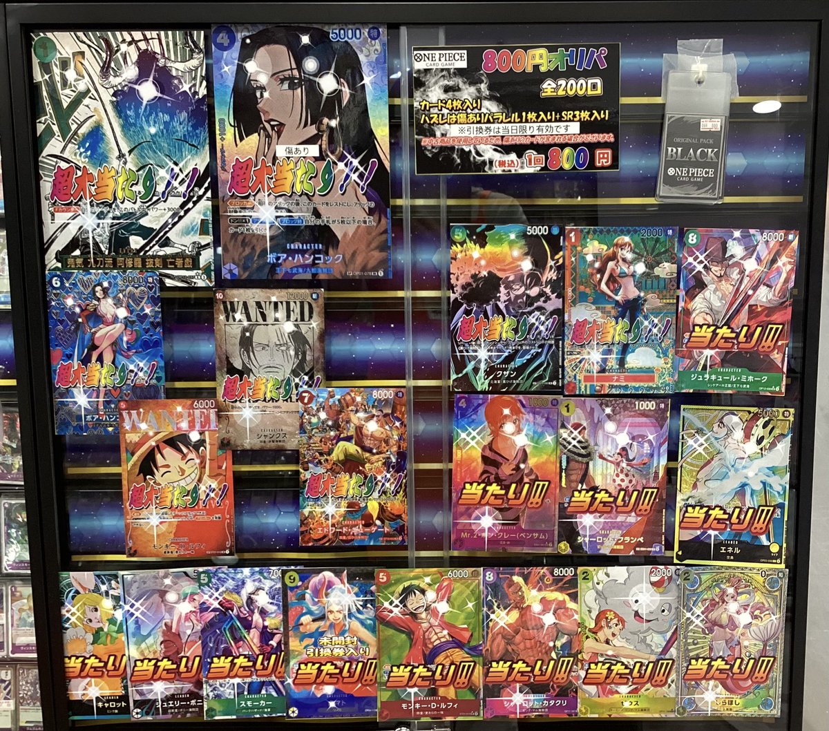 【ワンピースカード販売情報】 ワンピ800円オリパ、展開中です‼️ ✨全200口 ✨ ハズレでもパラレル1枚+SR3枚🔥 超大当たりは 亡者戯パラレル ‼️ 他にも最新弾のカードや、SPなど🤩🤩 運試しにいかがでしょうか⁉️