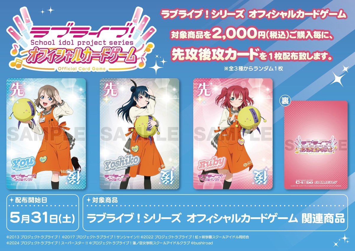【ラブライブカードゲーム 販売情報】 5月31日(土)から配布開始✨ 『ラブライブ!シリーズ オフィシャルカードゲーム』 対象商品を税込2000円購入ごとに1枚、ランダムで先攻後攻マーカーをお渡しいたします! 皆様のご来店をお待ちしております♪