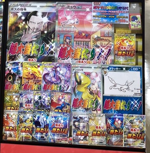 【オリパ 販売情報】 ⭐️ポケカ1000円オリパ⭐️ 新しく展開中 いたしました!! 今回の大当たりは…『ミュウex SAR』『ボスの指令』です!! 他にも画像のカードが当たります🍀*゜ ご来店お待ちしております️🩵️🩵