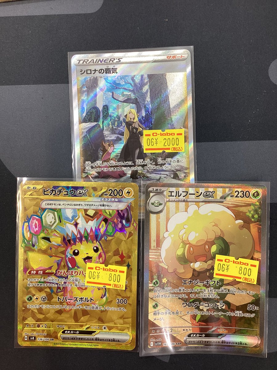 【ポケモンカード 販売情報】 ✴️シロナの覇気 ⚡️ピカチュウex UR 🌳エルフーンex 特価カードでショーケースに展開致しました 是非明日のご来店お待ちしております♪