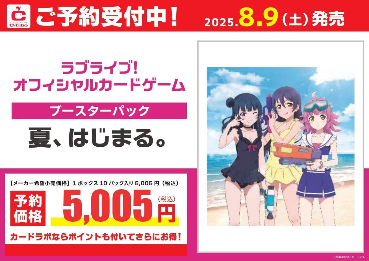 【ラブライブカード予約情報】 8月9日発売 ラブライブカードブースターパック 『夏、はじまる。』 ご予約受付中です 是非ご来店お待ちしております♫
