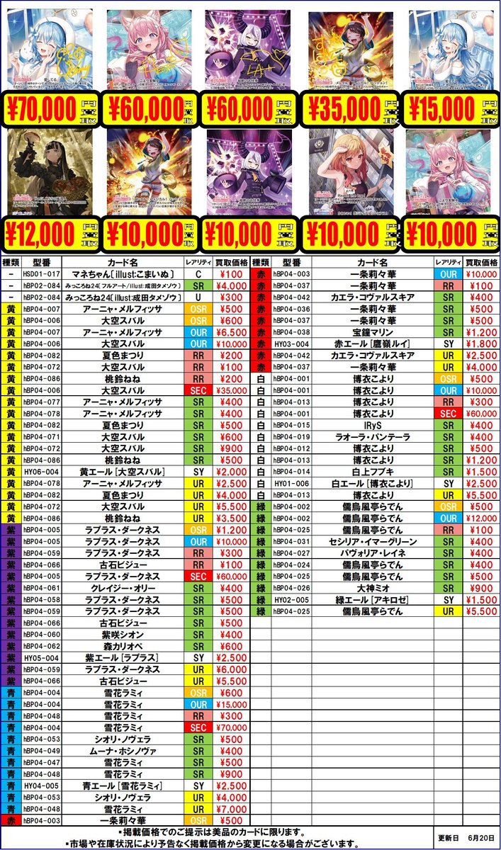 【ホロカ 買取情報】 ちょっと更新しました!! ⛄️雪花ラミィ OUR ¥15,000 🐚儒烏風亭らでん OUR ¥12,000 👾ラプラス・ダークネス OUR ¥10,000 🌃一条莉々華 ¥10,000 是非当店までお持ち込みお待ちしております✨️