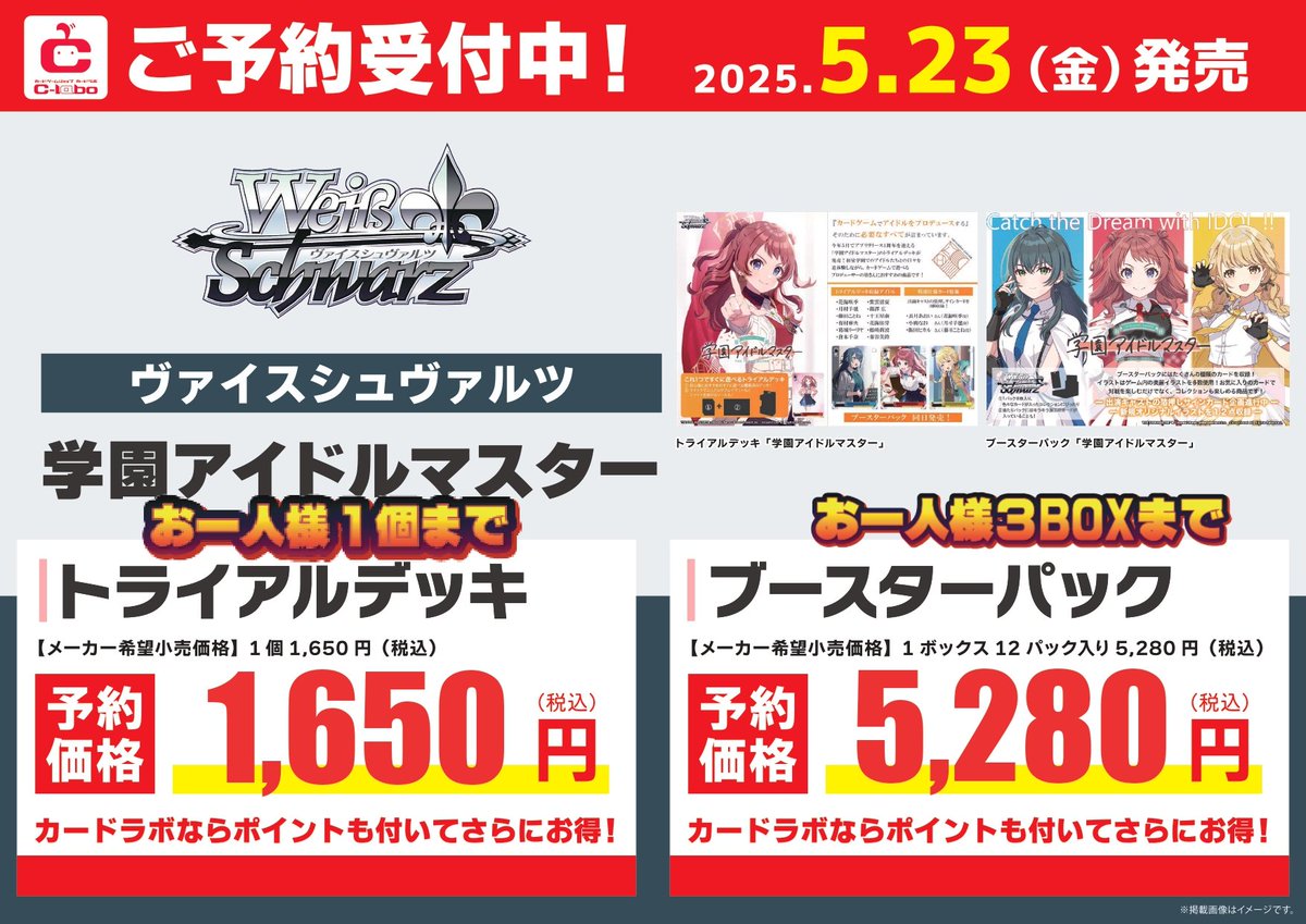 【WS 予約情報】 5月23日 発売 ヴァイスシュヴァルツ 「学園アイドルマスター」 ・トライアルデッキ ※お一人様1個まで ・ブースターパック ※お一人様3BOXまで 予約受付中です❗️ ご予約ご希望の方はぜひカードラボ郡山店まで