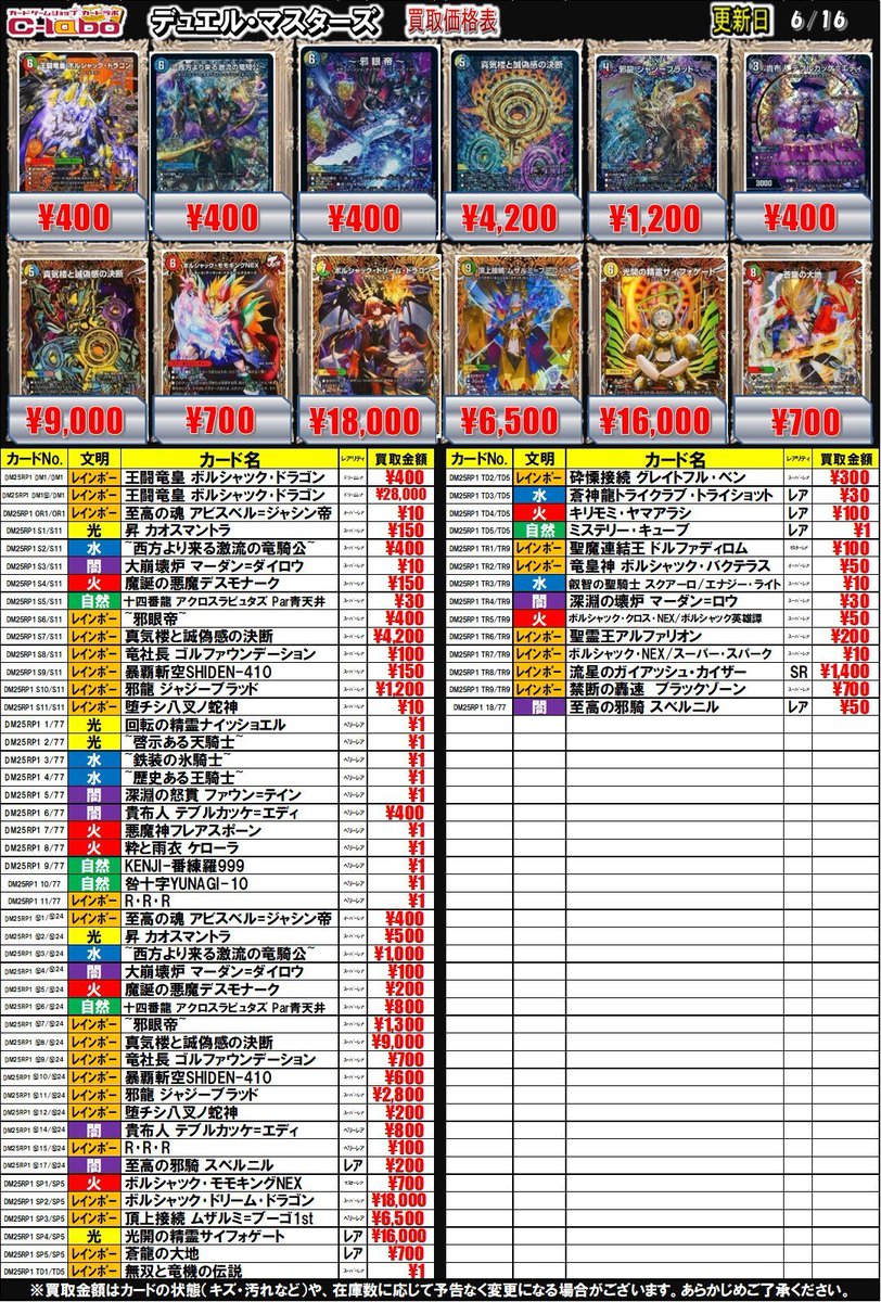 【デュエマ 買取情報】 ~邪眼帝~ 500円買取 王闘竜皇 ボルシャック・ドラゴン 400円買取 審判の精霊ラストジャッジ〔サイン〕 14000円買取 などなど 是非お持ち込みお待ちしております!!